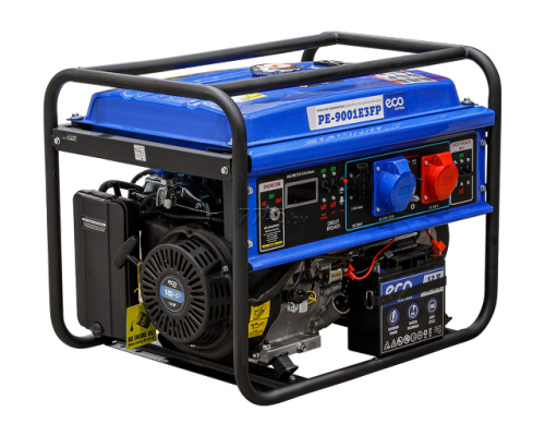 Бензиновый генератор ECO PE-9001E3FP — это востребованная модель для энергообеспечения небольших предприятий, стройплощадок и прочих энергоемких потребителей однофазного и трехфазного напряжения. В генераторе имеется переключатель напряжения для 220 и 380В, также есть электростартер + АКБ в комплекте. К достоинствам данной модели генераторов, несомненно, стоит отнести следующие характеристики: